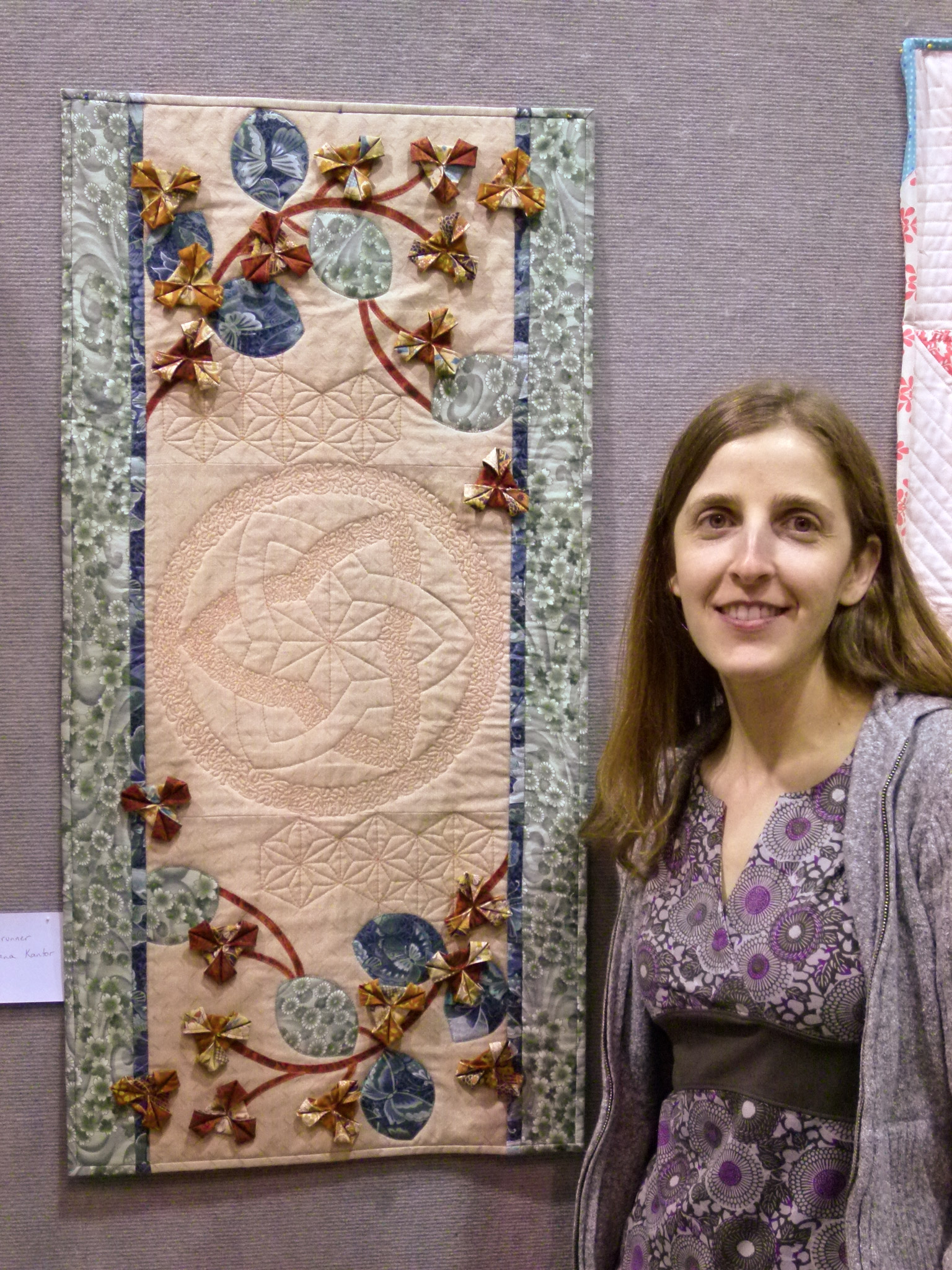 First, here’s Diana Kantor with her amazing table runner. It has 3-D folded flowers and leaves in addition to that beautiful quilted design in the center!