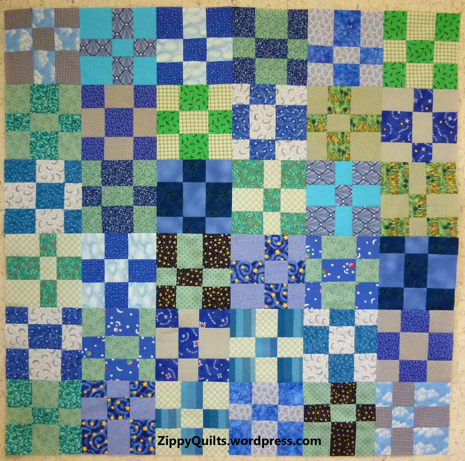 Either replace one block with 4 little blocks 1/4 the size of the usual, or replace 4 regular blocks with one big one. Either tweak makes the overall quilt design more interesting.
