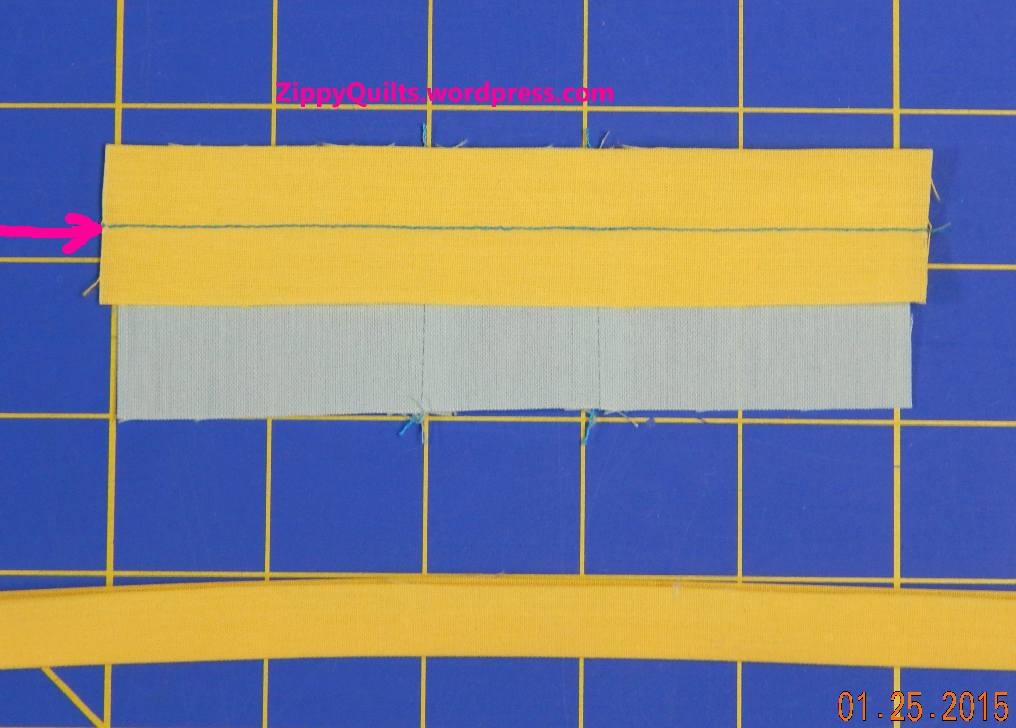 Cut a 1″ strip of fabric and lay one edge along the raw edge of the piece where you want a narrow inset. Stitch through both the strip and the quilt piece 1/2″ away from the edge, either by using the 1/2″ mark on your machine’s throat plate or by marking the center of the strip.