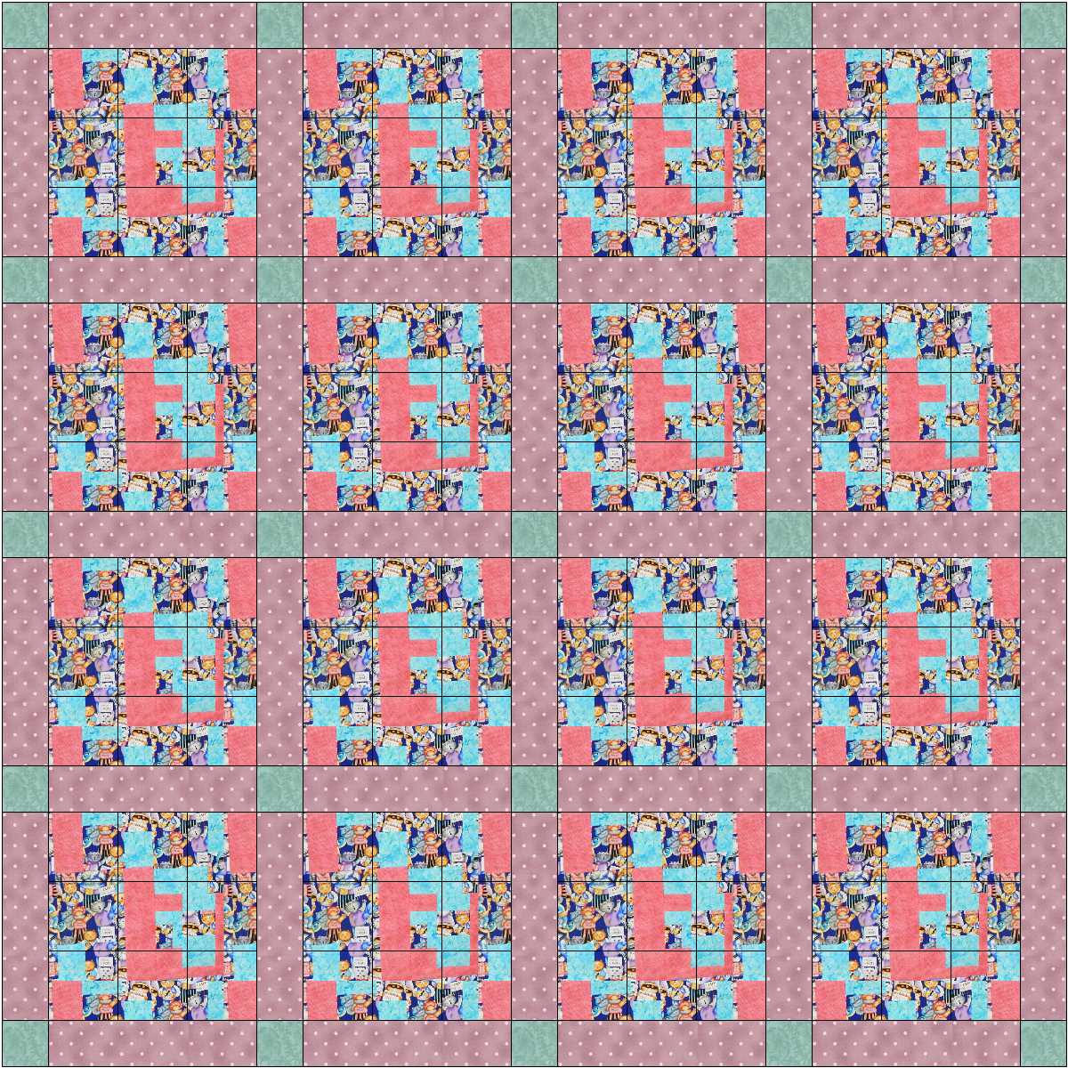 This is my second attempt to follow a Sherri Lynn Wood “score”. I followed her instructions more closely than last time, and I like it a lot less!I chose a focus fabric from my novelties because this is a quilt for a child. I followed Sherri Lynn’s directions to make some “rules” and cut up 3 fabrics for the quilt, etc, etc. When I finished, I thought it needed something to “pull it together”, so I added a border of the focus fabric.