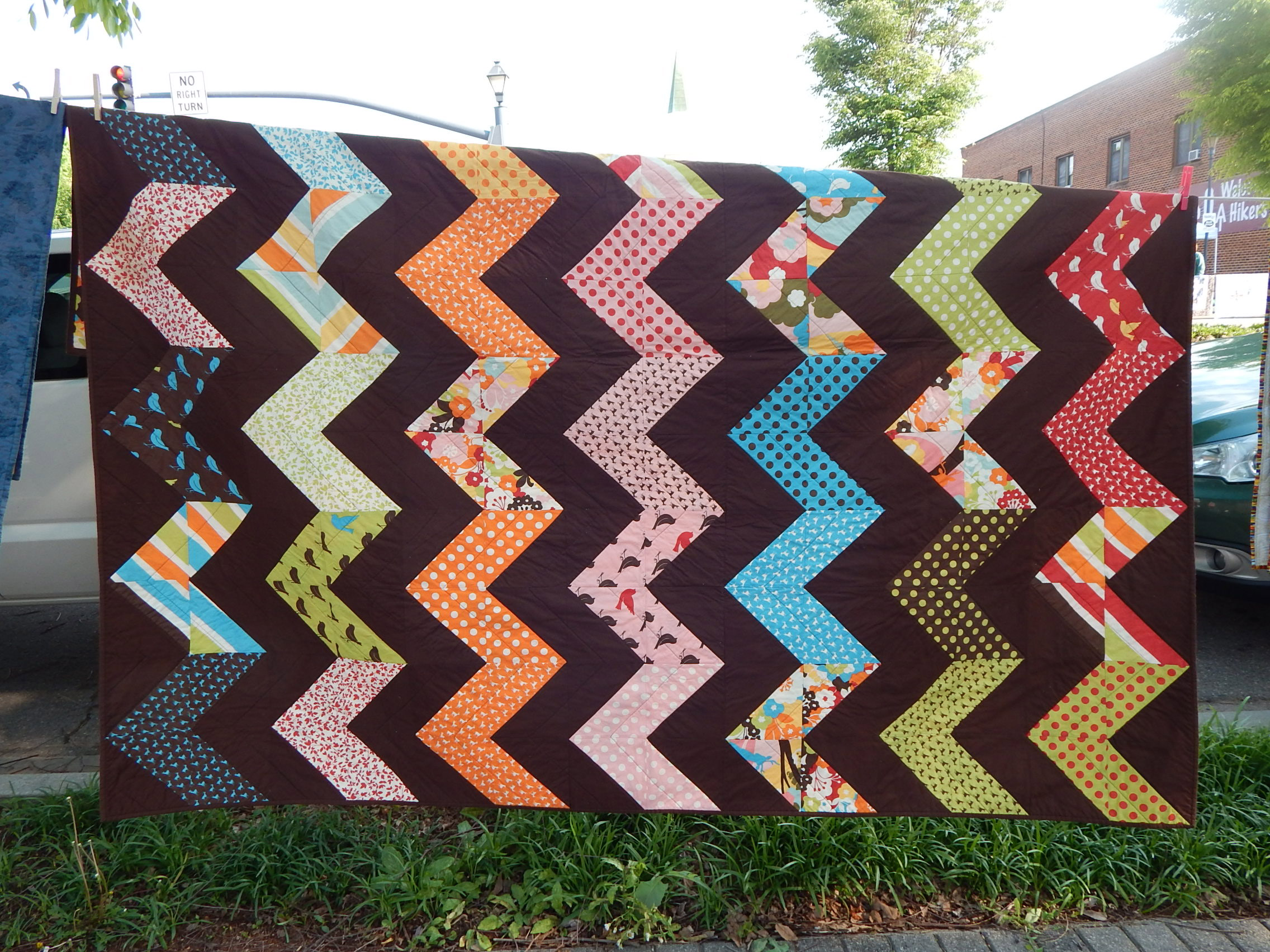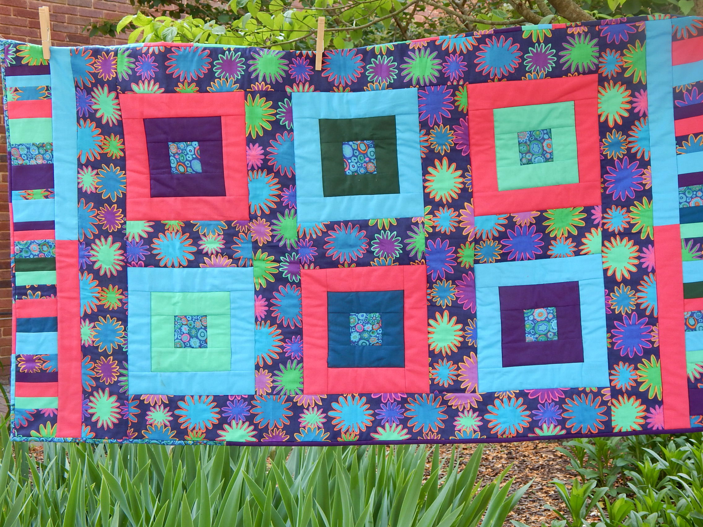 The first quilt was composed of half square triangle blocks, so I was able to try out the (fairly expensive) Loc Bloc ruler I recently bought to make trimming these blocks to size easier. The ruler worked great with just a little practice, and I got to practice my machine quilting on the finished quilt.