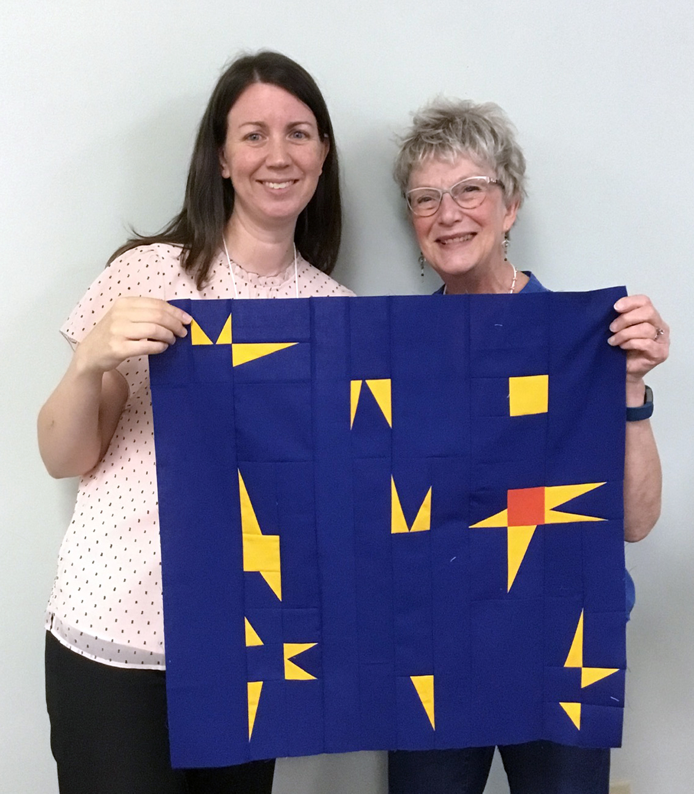 I’ll have a tutorial on this whole quilt when it’s finished, but here’s an overview of how I used Kraft-Tex to avoid traditional appliqué . I cut out the alien’s head using one of my circle cutters and attached it to the block with washable glue stick. Then I cut the outline from black Kraft-Tex and put it over the raw edge, with the raw edge kind of centered underneath.