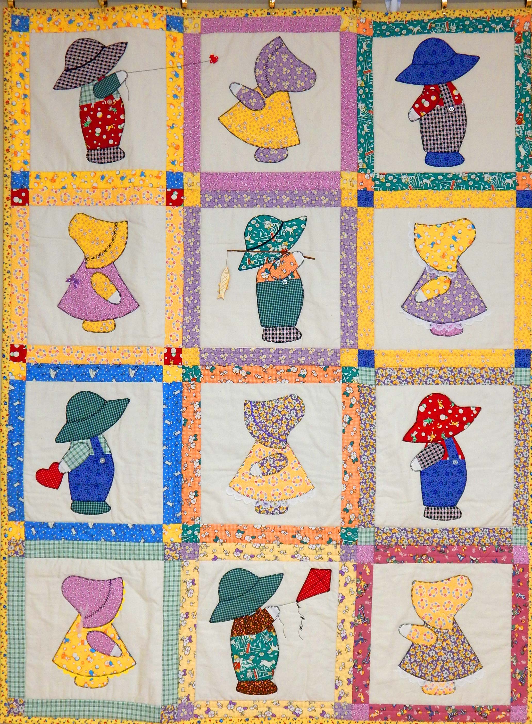 Sunbonnet Sue Visits Quilt in a Day was done with Eleanor Burns’s method using fusible interfacing to produce turned edges