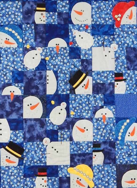 The snowmen and noses were a combination of fusible appliqué and Eleanor Burns’s appliqué with fusible interfacing.  I have washed this and it held up fine.