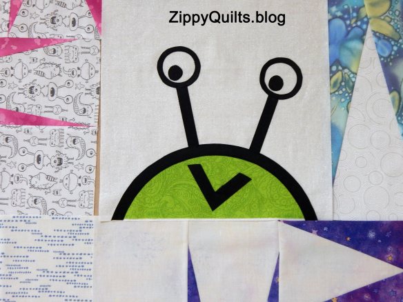 I’ll have a tutorial on this whole quilt when it’s finished, but here’s an overview of how I used Kraft-Tex to avoid traditional appliqué .  I cut out the alien’s head using one of my circle cutters and attached it to the block with washable glue stick. Then I cut the outline from black Kraft-Tex and put it over the raw edge, with the raw edge kind of centered underneath.