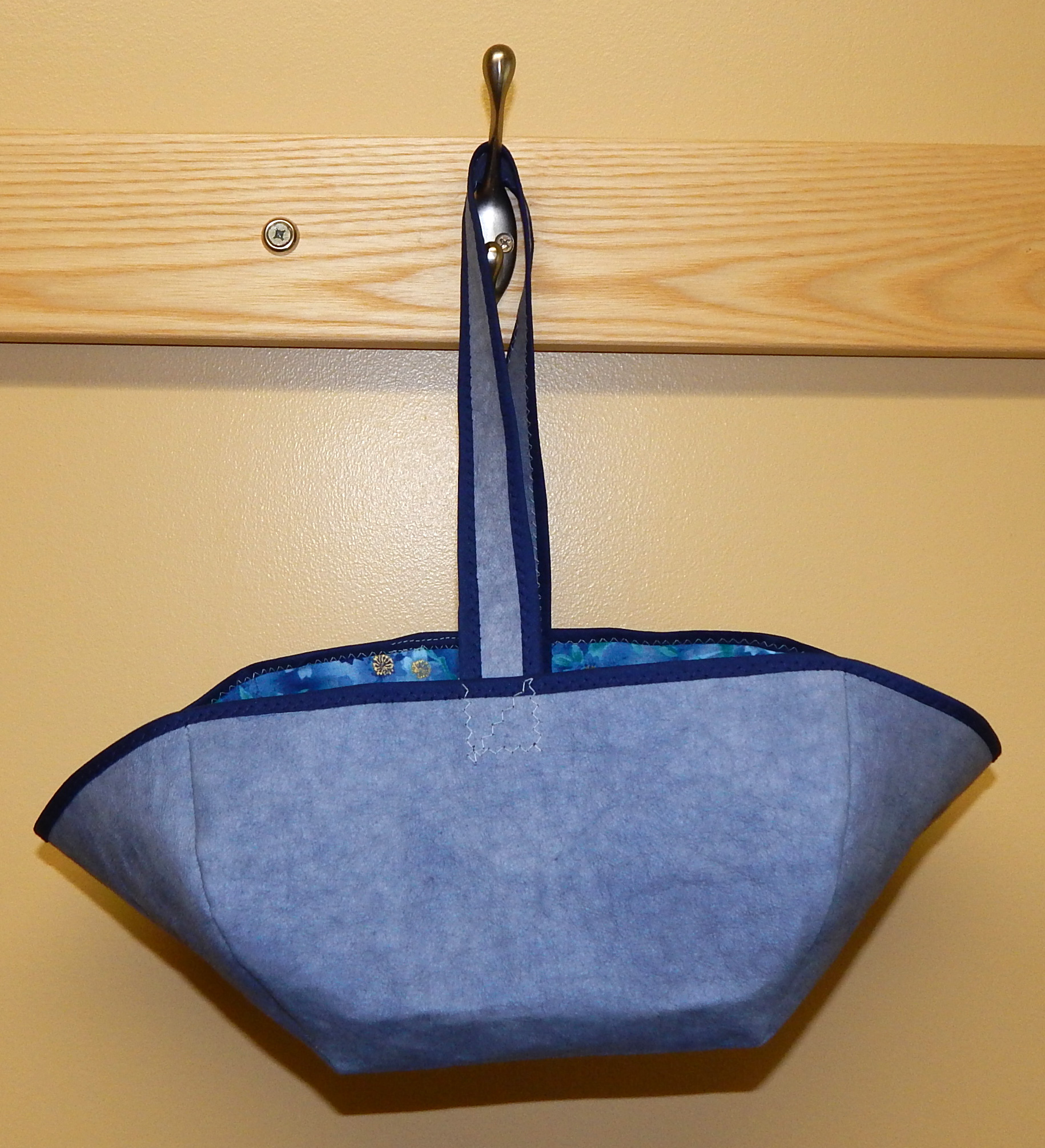I made another one of the larger baskets, adding a handle, and am thinking of hanging it in the laundry room to hold stray socks.  (Although, really, does a missing sock ever show up, or is this a futile plan?)  This picture better shows the lovely color of the Kraft-Tex, which is one of the newer pre-washed offerings.