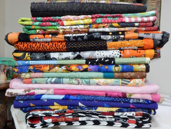 One of my quilt groups makes donation quilts about 40″ square for various organizations. The size is easy to construct and quilt at home, and is appropriate for the children who receive the quilts.  Here are the recent group donations: