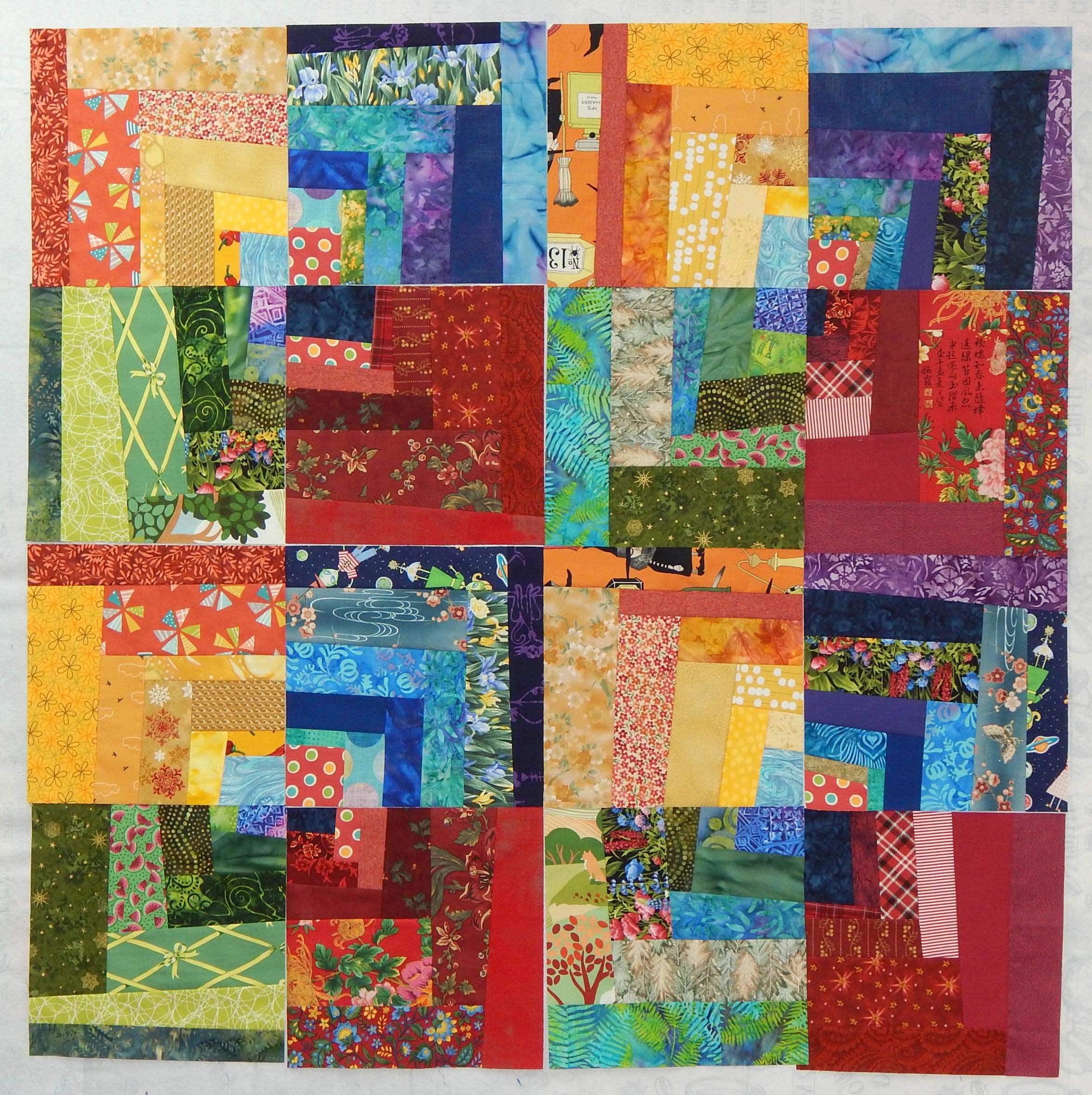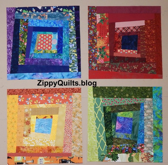 First make a big wonky log cabin block. Our blocks started with a 5″ square, which was modified to make a wonky center.  It was then surrounded by strips from my scrap bins, and occasional strips were trimmed so they were wonky, too.