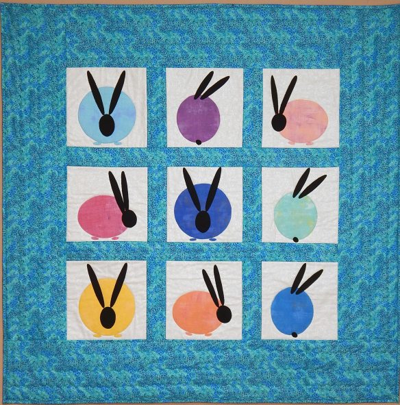 After showing the Rabbits! quilt made from Debbie Maddy’s “Usagi” pattern, I lent the quilt itself to a local shop that carries the commercial version of Debbie’s Shibori-dyed fabric. Then I decided to teach the quilt at Studio Stitch in Greensboro, so I made a second quilt using bright Grunge.