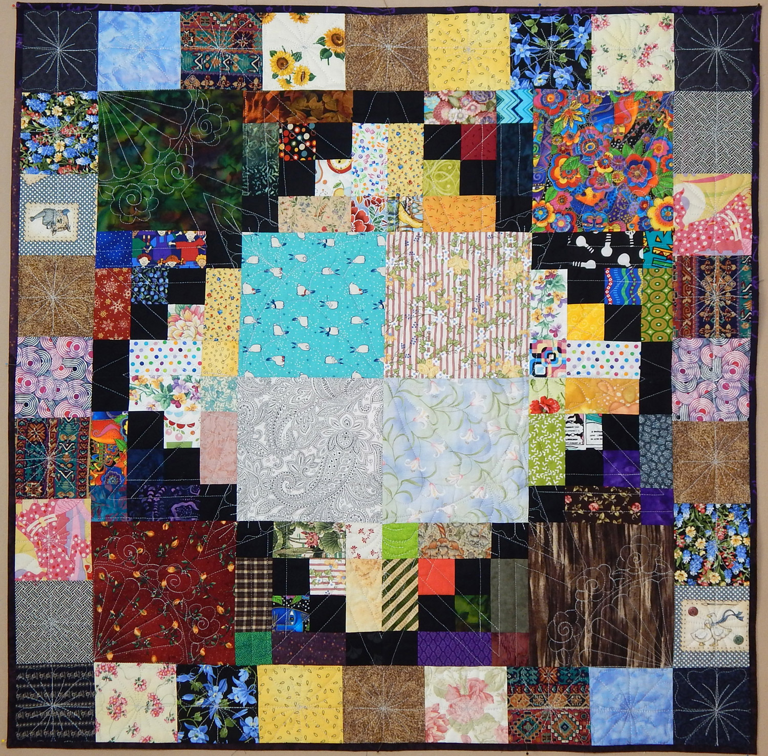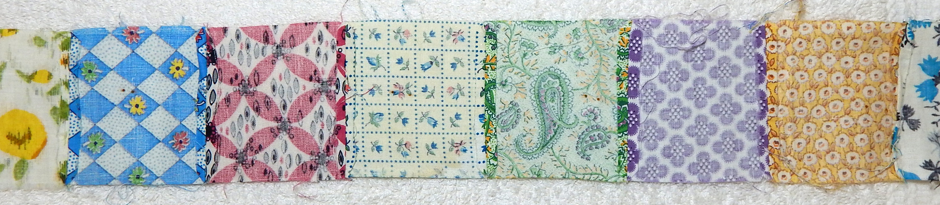 My granny made quilts entirely by hand. I watched her piecing, sitting by the window where the light was best. I played under the quilt frame in the “front room” when a top was finished. I never knew her to have friends over to help with the quilting; she did it all herself. She tried to teach me to piece; the main thing I recall is the idea of loading multiple tiny stitches on the needle before drawing the thread through. I remember a lot of her fabrics and was surprised to find these identical-appearing reproduction fabrics some years ago: