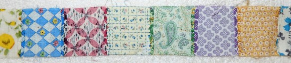 Once I got a few pieces taken apart, I treated them with Terial Magic in the hope of avoiding further fraying. I cut the squares down to 2-1/2″ to square them up and get rid of ragged edges, and I’m ready to put some of them together. The plan is to make them into Arkansas Crossroads: