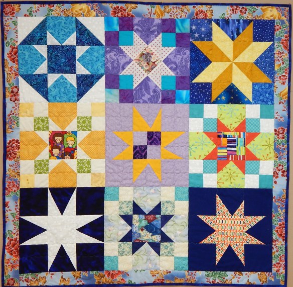I got the orphan blocks out recently and selected all those that finished 12″ square.  I combined them into two donation quilts, which finished 42″ square.