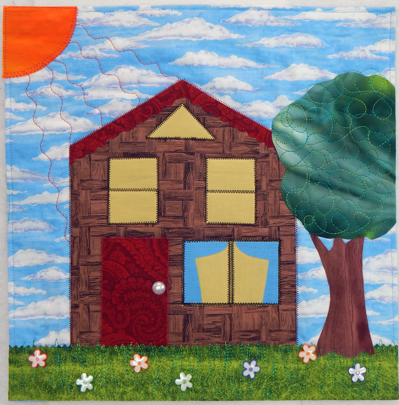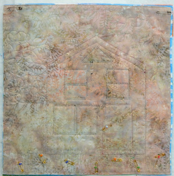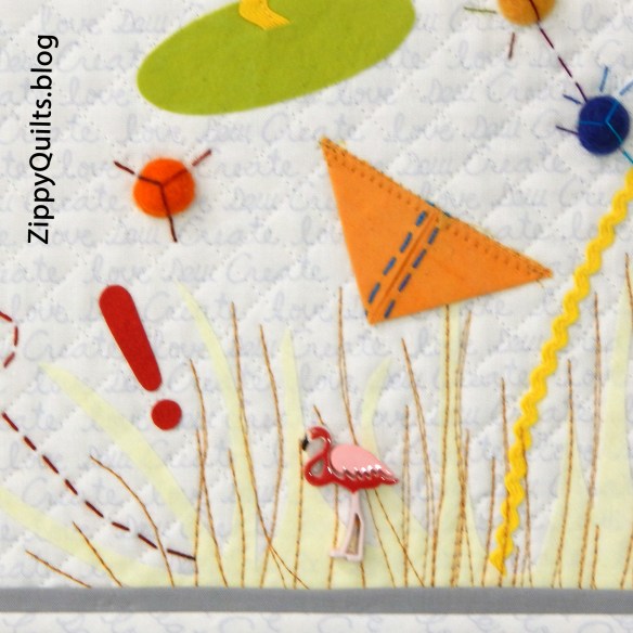 The flamingo is a plastic button! Following a suggestion from a reader (Elizabeth, in response to my Habitat House), I removed the shank and glued the button to the quilt.