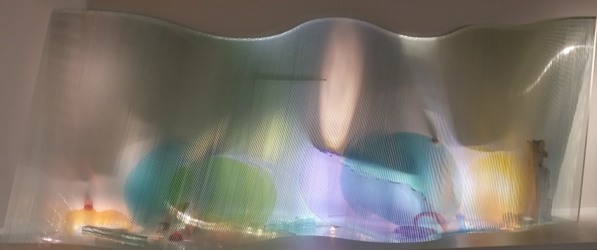 Threshold, by Danny Lane is a huge piece made of stacked glass. The wall of glass is lighted from behind, and there are a variety of objects behind the glass, providing interesting shapes and colors.