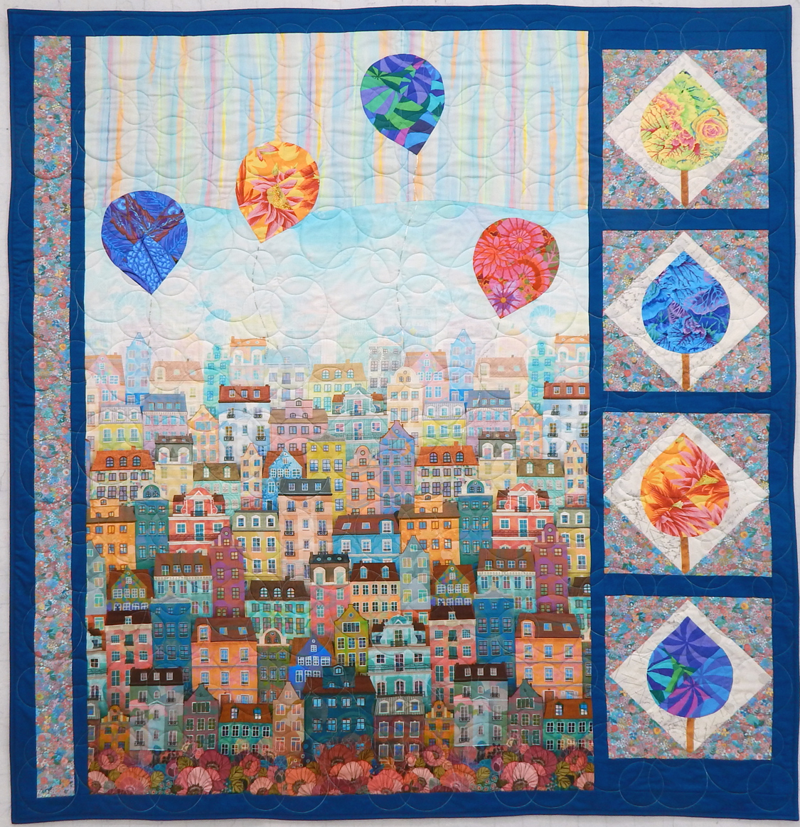 This quilt, made from a pattern, got a 3rd place ribbonl. The circle is on a black background, so the quilt is square, VQF 2016