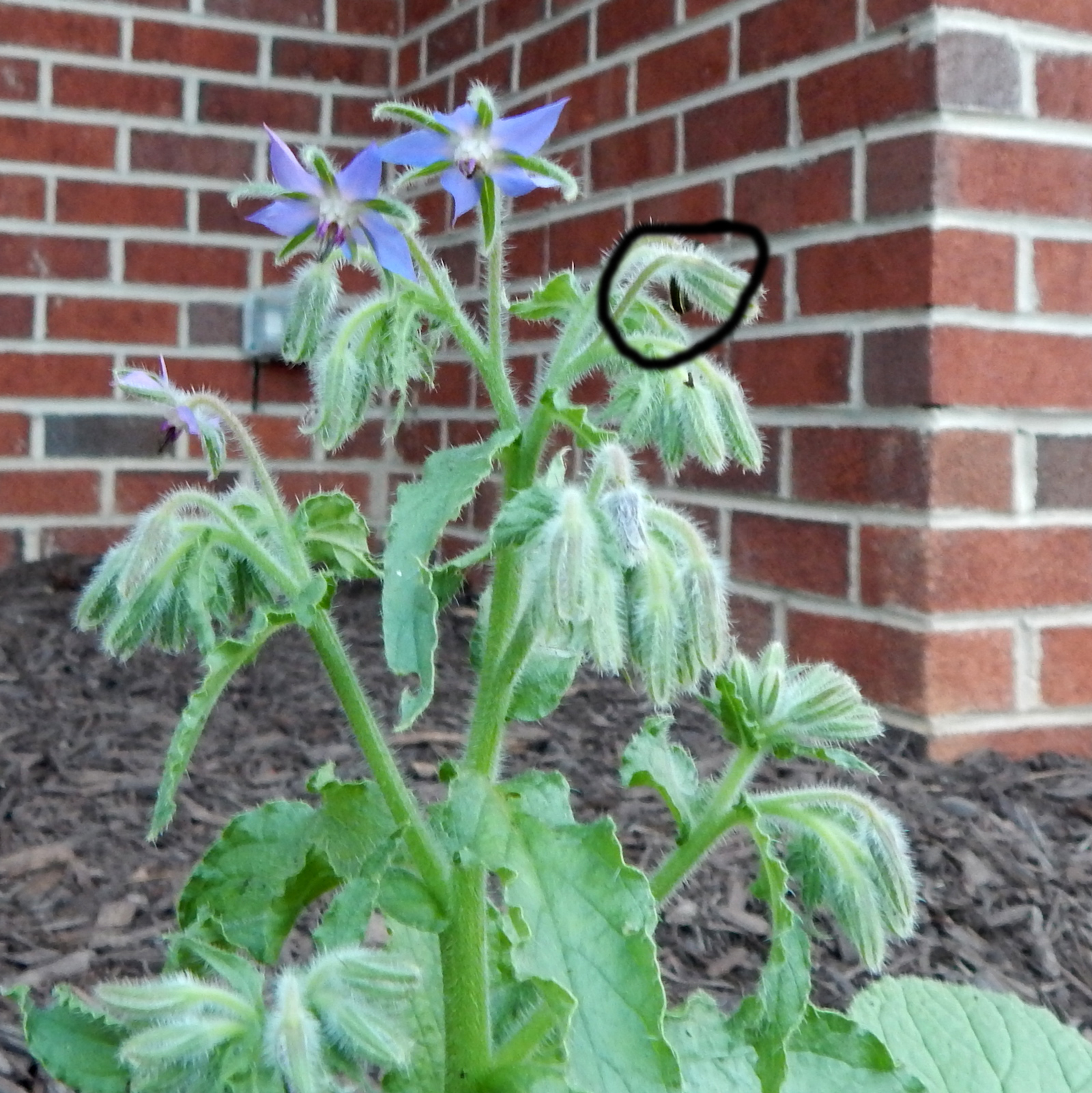 A blogging friend in South Africa wrote about her borage, so I planted some and it’s beginning to bloom! The circle shows a little hitch-hiker I found on the plant.