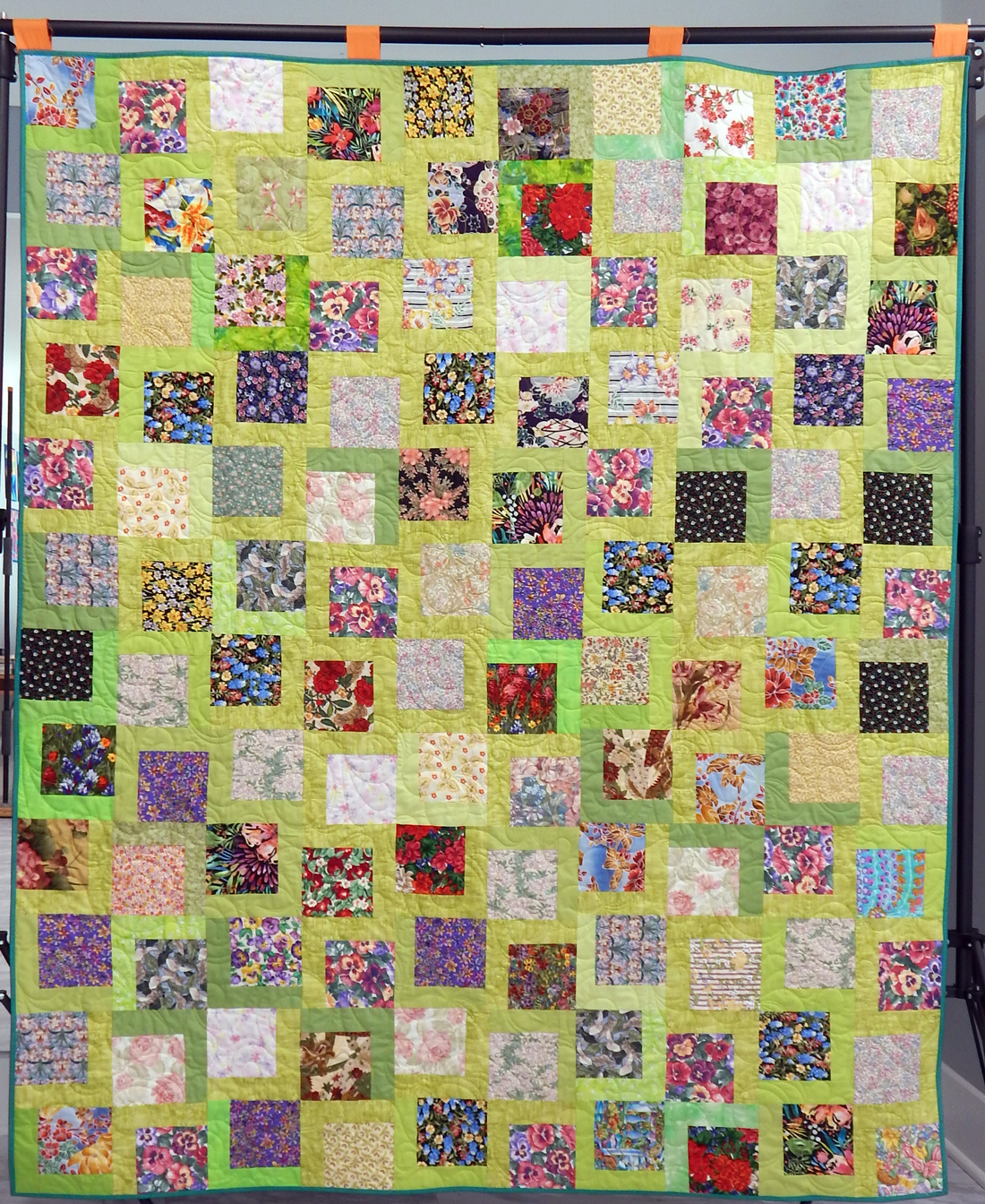 First, here’s the latest donation quilt, made to use up 5″ squares in floral fabrics. I just added the strips as “leaders and enders” while working on other projects, and here it is.