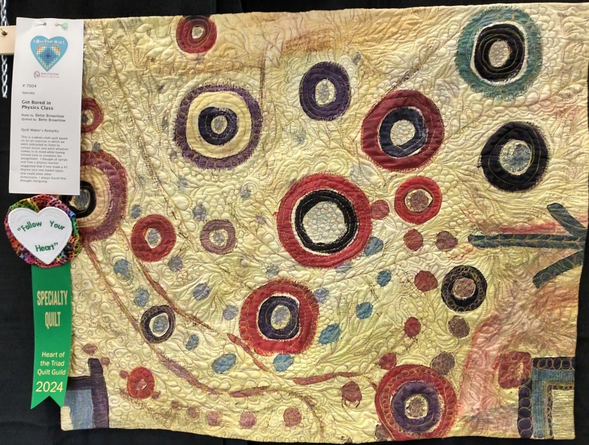 HOTT-Bette-Brownlow Published May 19, 2024 at 1500 × 1135 in Heart of the Triad Quilt Show Got Bored in Physics Class, pieced and quilted by Bette Brownlow, was notable for its unusual techniques and fun title Share this:Tweet Email a link to a friend (Opens in new window) Email Like Loading...