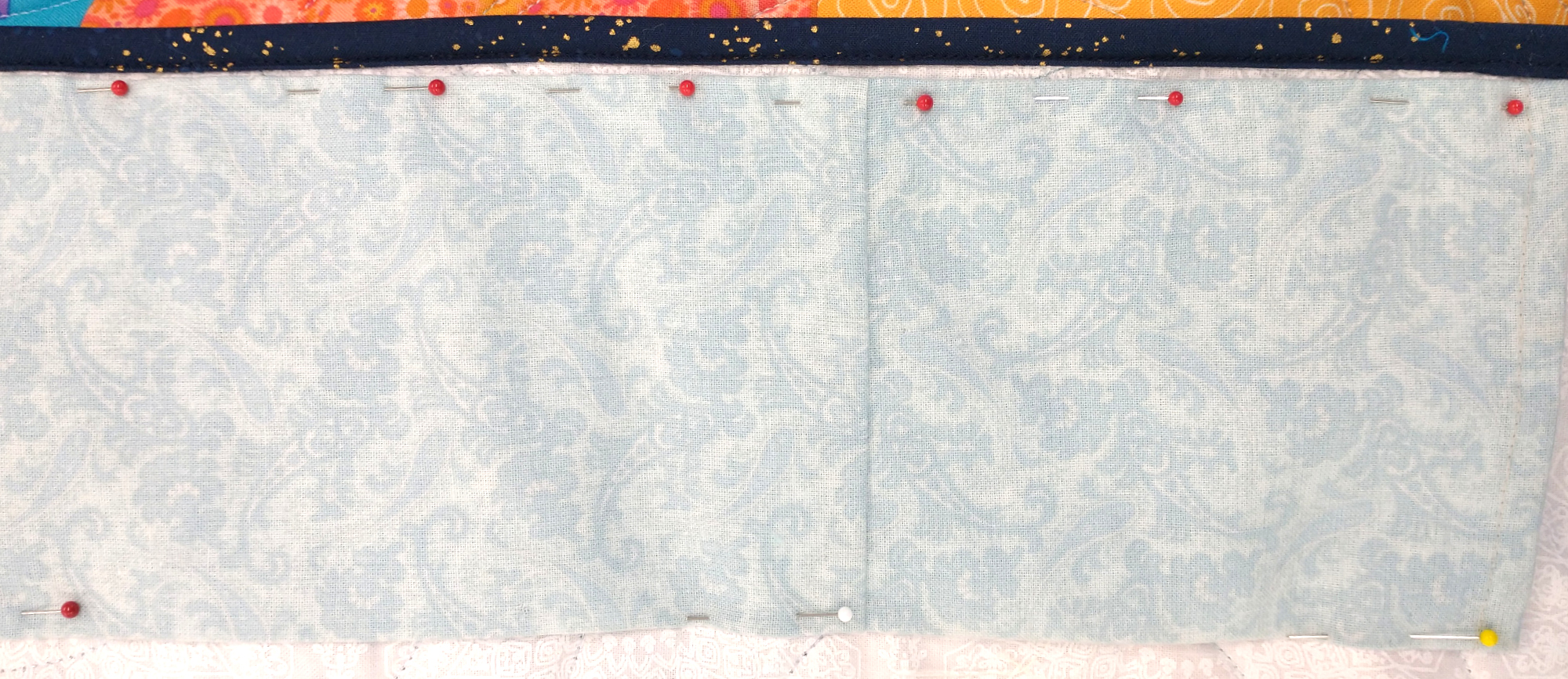 However, if the sleeve is going to be on the quilt only long enough for me to take photos, I’ve found that straight pins work just fine to attach the sleeve! I put the pins fairly close together along the top of the sleeve and space them out a bit more along the bottom edge. On both edges I bury the tips of the pins–you know why!