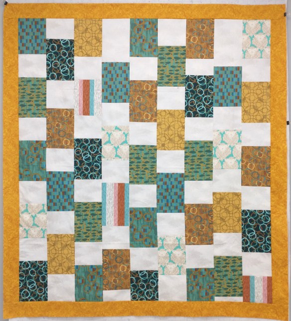 Luckily we all bring shoeboxes of fabric we no longer want and everyone takes something for a future project. I went to those boxes and found that a friend had donated a set of coordinating fat quarters she’d changed her mind about! This quilt is the result.