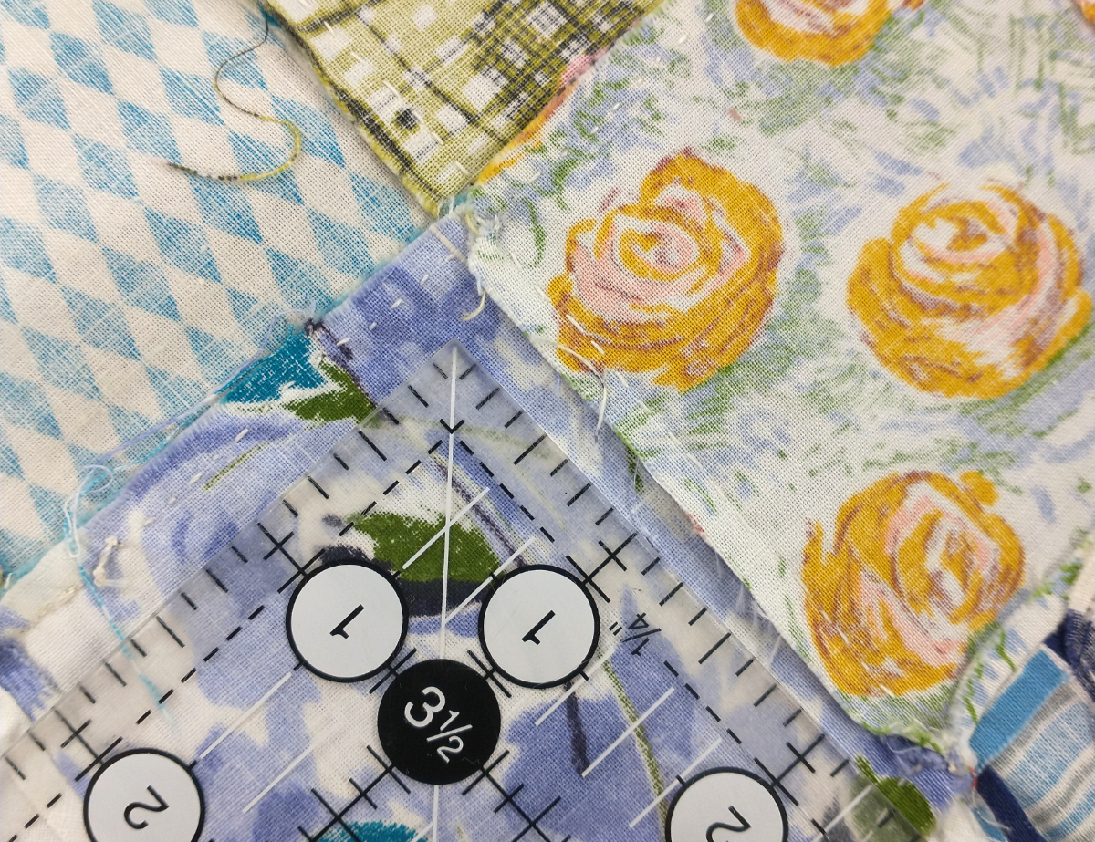 Granny pieced by hand and her seam allowances were only about 1/8″! However, there was NO chance those seams were coming apart. She took tiny stitches and backstitched frequently to lock the seams. I originally tried taking some of it apart to re-use, but that was almost impossible!