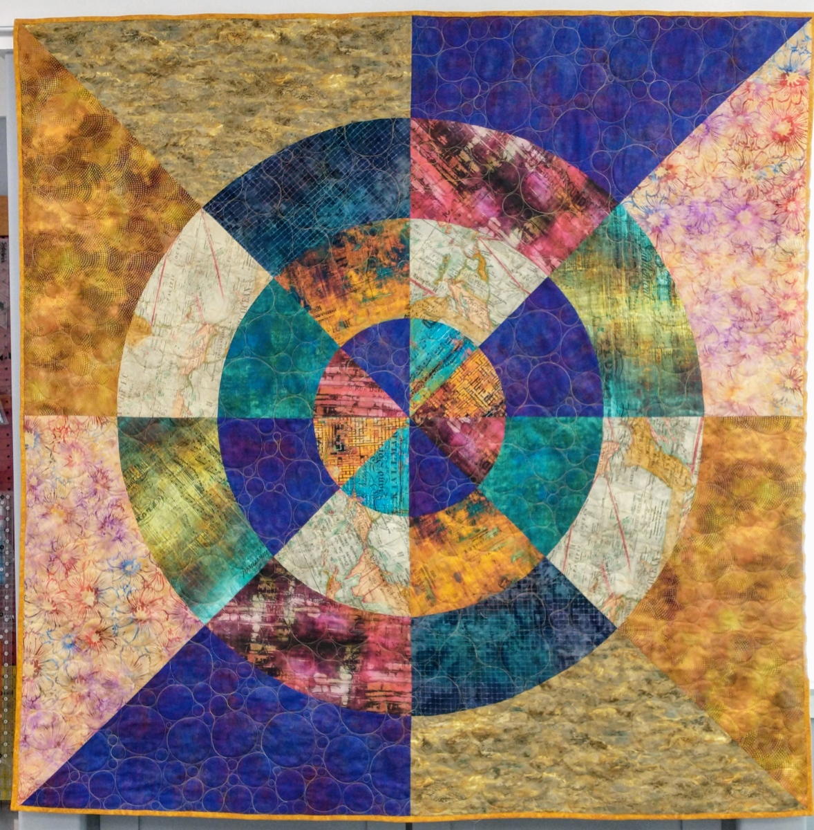 I started Karla Alexander’s Blue Onion quilt but really hated her process, so I made only a few blocks and used them as the focus of this quilt.