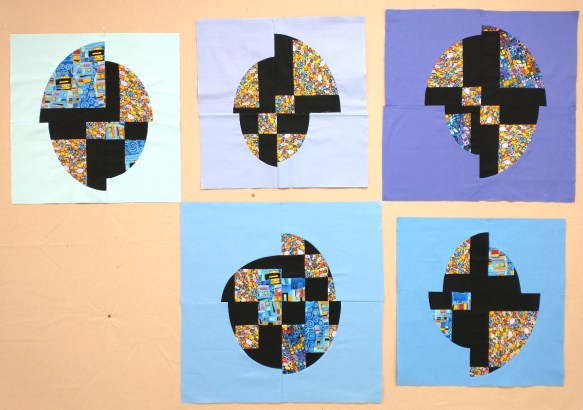 An interesting design challenge. When I look at them grouped together I’m disoriented because some of the ovals are northwest/southeast and some are northeast/southwest. If you did use them all in one quilt, which would get them all out of the way, I’d space them widely apart. I’ve just bought Emily Bailey’s Scrap Quilts from Crumbs, Strips, and Strings in which she uses crumb-pieced backgrounds and that concept could be the spacers for your Oval Orphans.