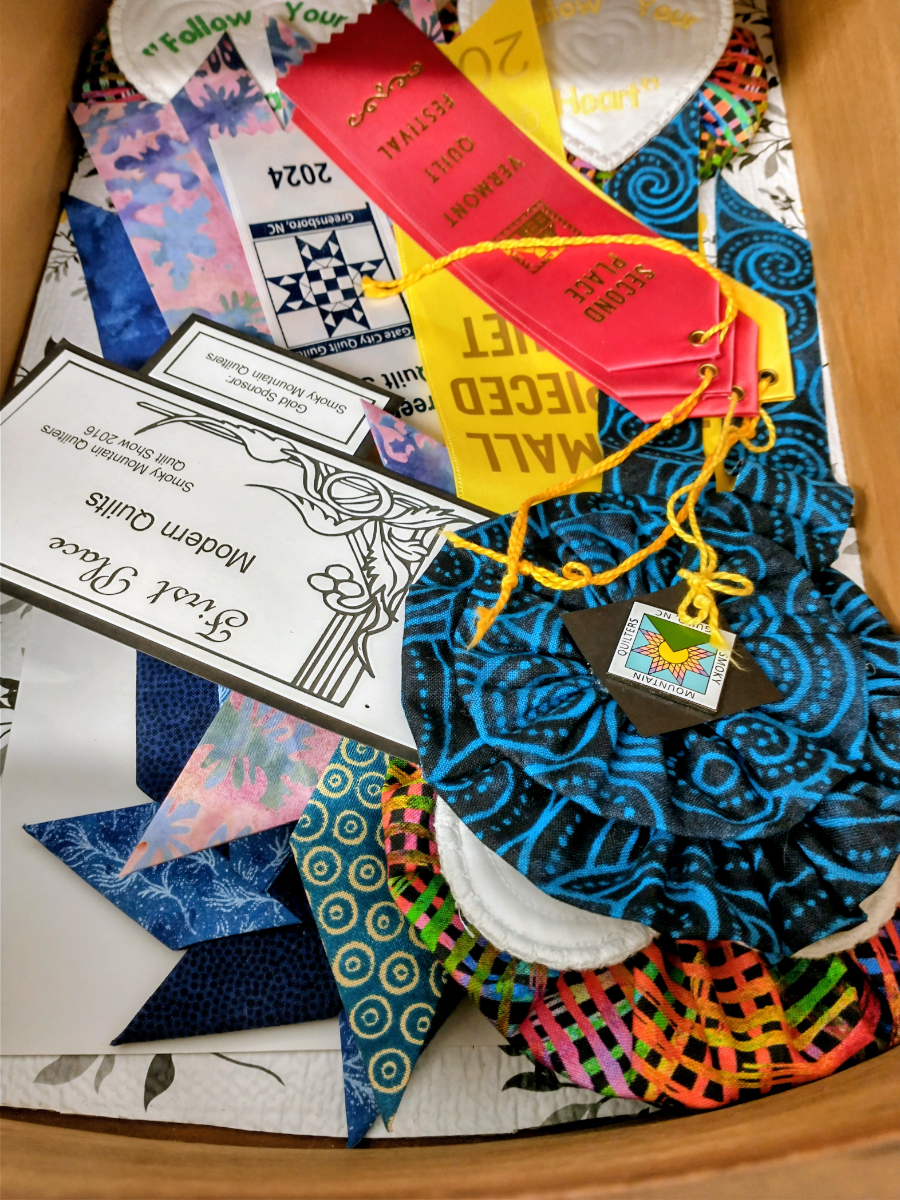 In the same drawer (different section) were my show ribbons, another thing I don’t know what to do with. I just left them for now. I know some people leave them on the winning quilts, but since I give my quilts away that’s not an option.