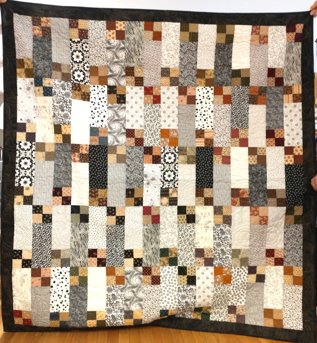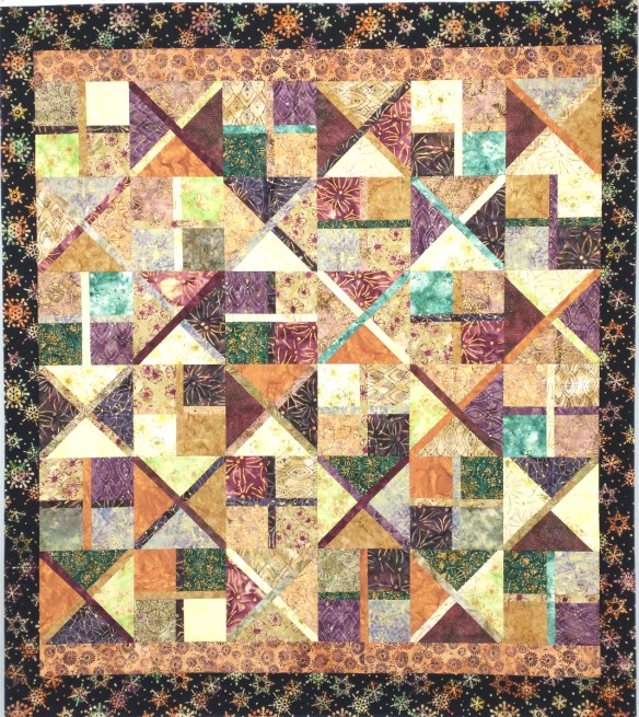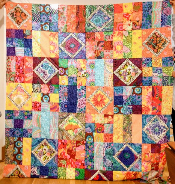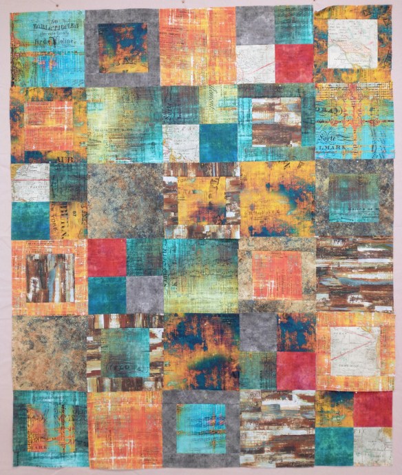 Here’s the quilt top, made to use up the beautiful fabric from the Robert Kaufman Ancient Beauty fat quarter bundle I couldn’t resist. I already made one quilt from the bundle, so I’ve done my thing. This one is intended for Flying Horse Farms, so I’ll send it to my friend who quilts those for our group.