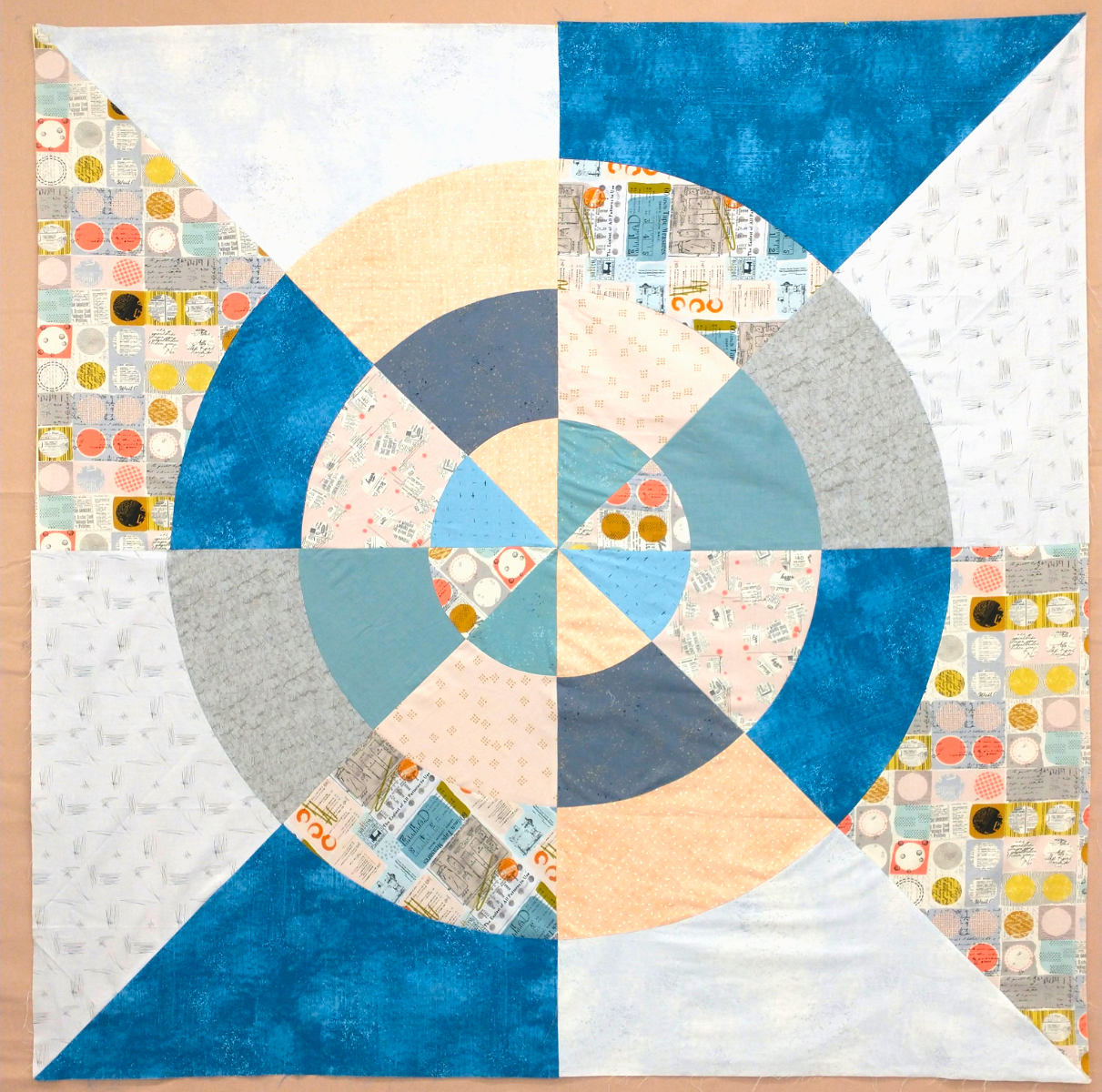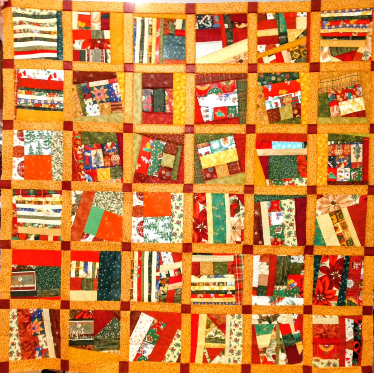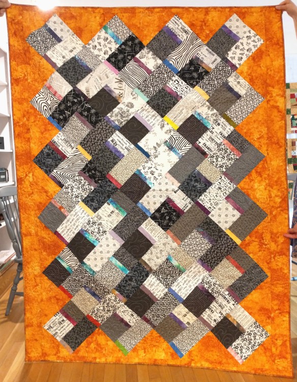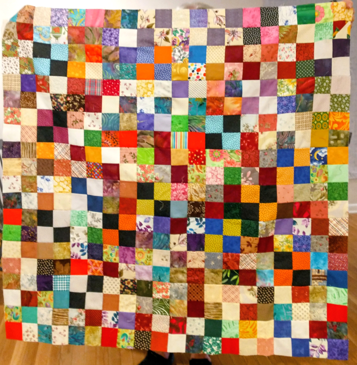 I very much enjoyed the process. The blocks are fairly complicated to make, so it wasn’t just a mindless task, and there was the fun of all the various fabrics. It was possible to chain piece, so I was able to listen to a book while sewing. Due to the complexity of the blocks I did make a couple of mistakes along the way, but those blocks just went into the orphan block bin. And the blocks were made from leftover fabric anyway, so no worries.