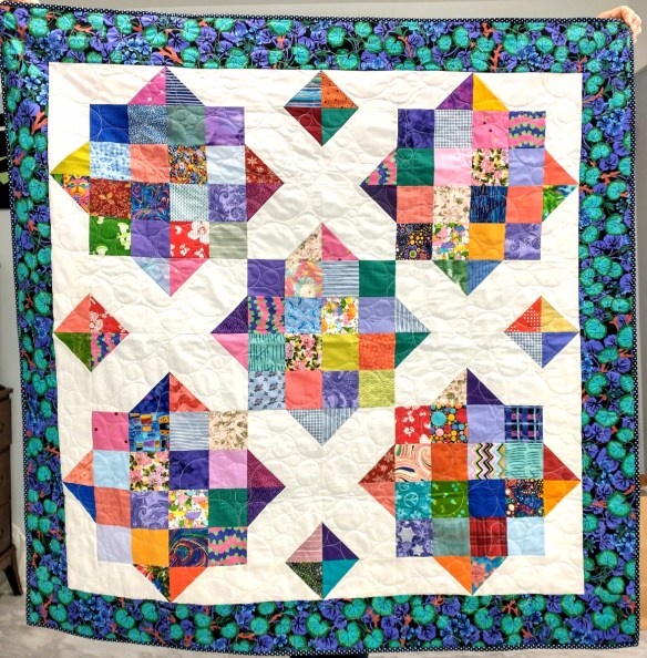 I recently found this pattern from 2014 in my “patterns not yet done” notebook, and it came at a good time. One of the UFO boxes I’m trying to empty contained a set of 12″ scrap blocks, so this patter was just what was needed.