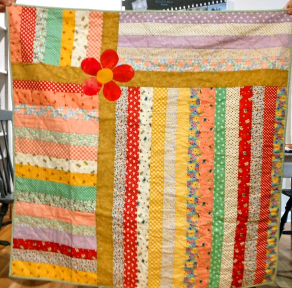 It probably seems like I haven’t made a quilt in a while, but it’s just that I haven’t FINISHED anything in a while! So finally, here is a floral quilt for Ronald McDonald house. It’s been hanging around needing binding for months–you know how that is!