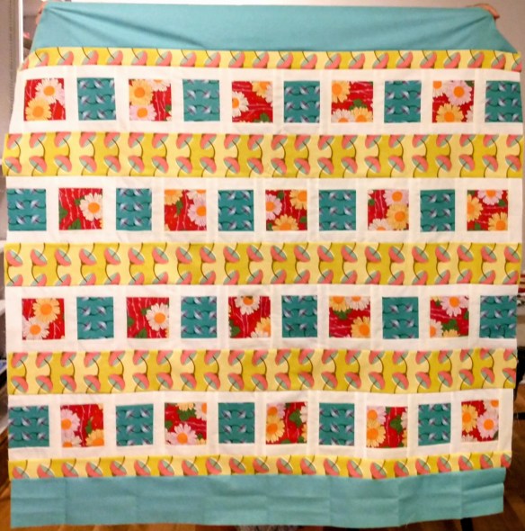 With the added sashing and borders, this is the right size for Flying Horse Farms, so I will save it for my friend Jerri to quilt. Until it gets to her it can be the what-not-to-do example for beginning quilting–ha!
