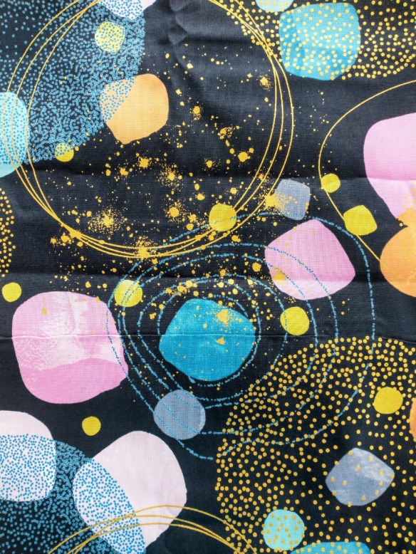And the background looks like solid white but it actually has a pattern of fine blue lines. Another time I probably wouldn’t choose such a light background for a child’s quilt, but…