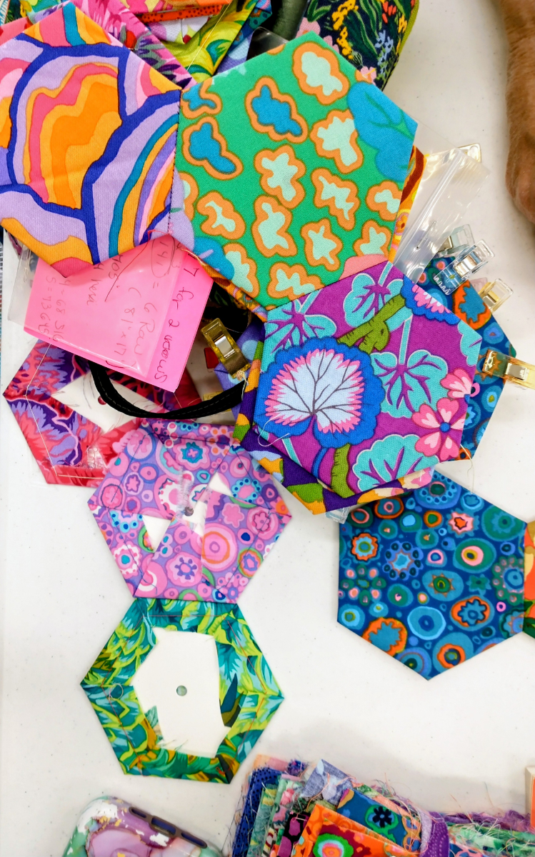 Another friend has decided the solution for her EPP (English Paper Piecing) issues is to make BIG pieces! She’s cutting her scraps all to the size she needs for these hexies!