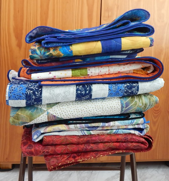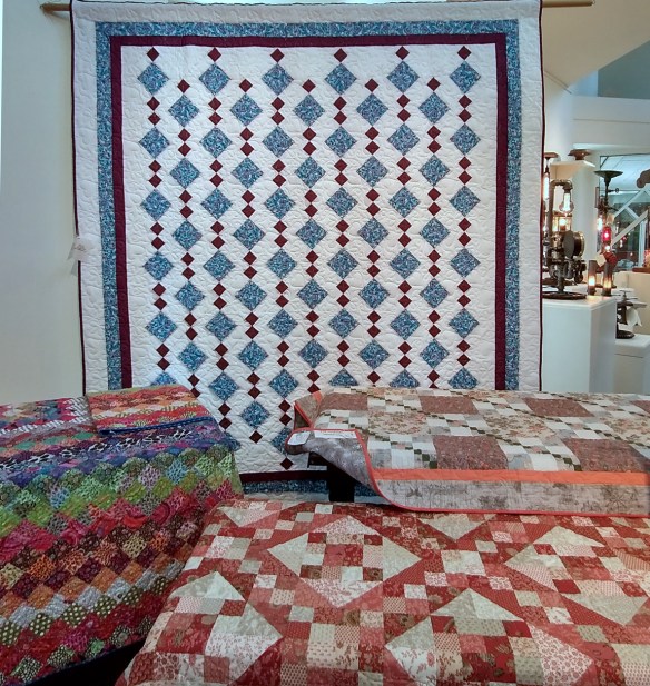 This is the quilt I had published in Quick + Easy Quilts recently, though their quilt was in holiday colors. This is the orange one I made to test the pattern before submitting it. It’s easy and would make a great second quilt for a relative beginner.