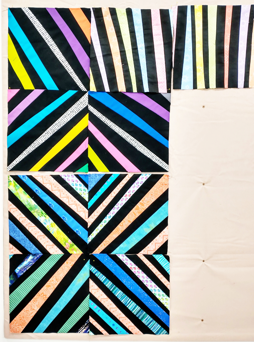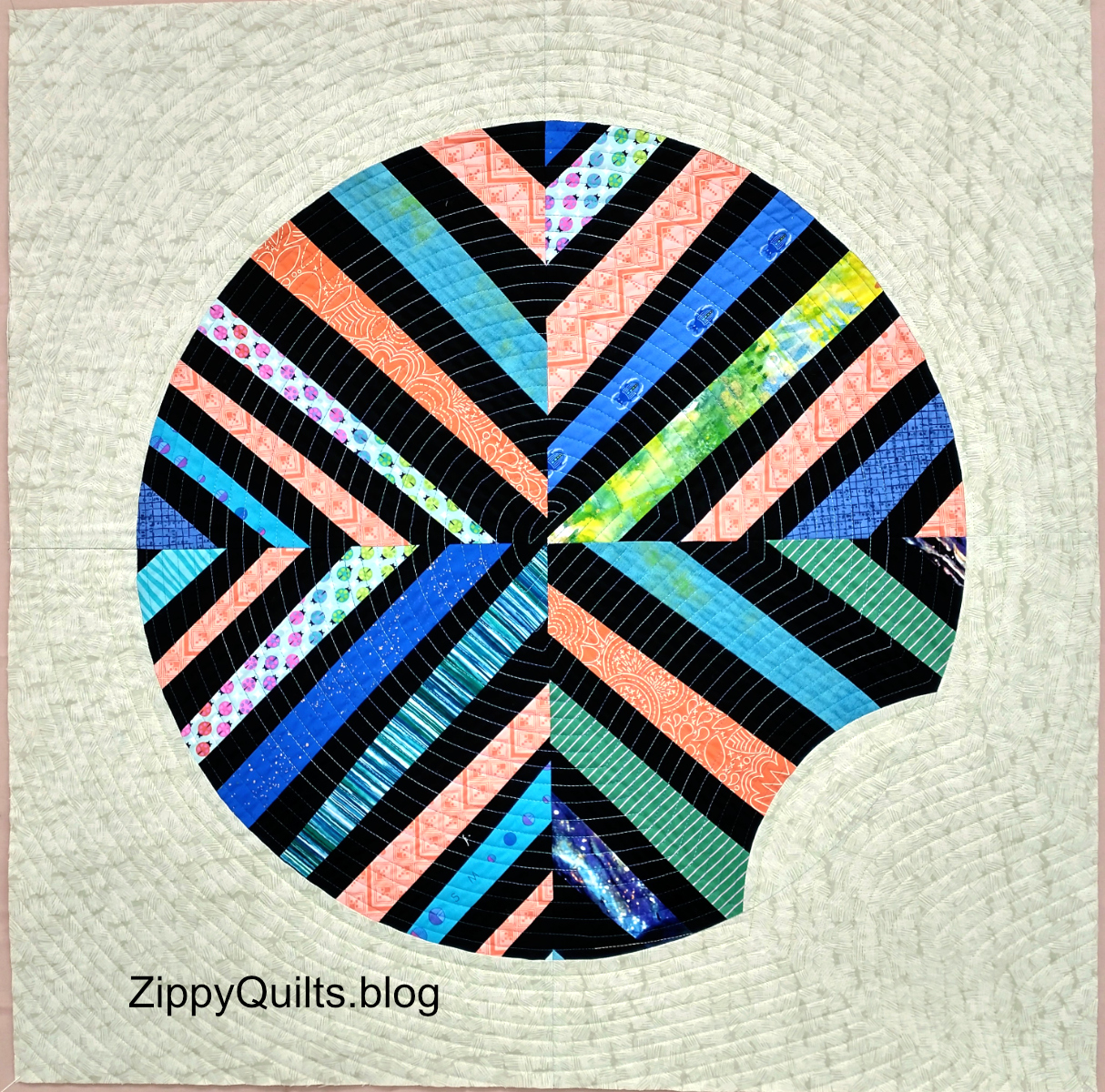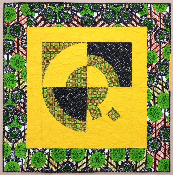 Then I found this abstract ombre print called “Playgrounds” and liked it even better. It’s a Moda fabric. So I made another Treble quilt, and here it is.