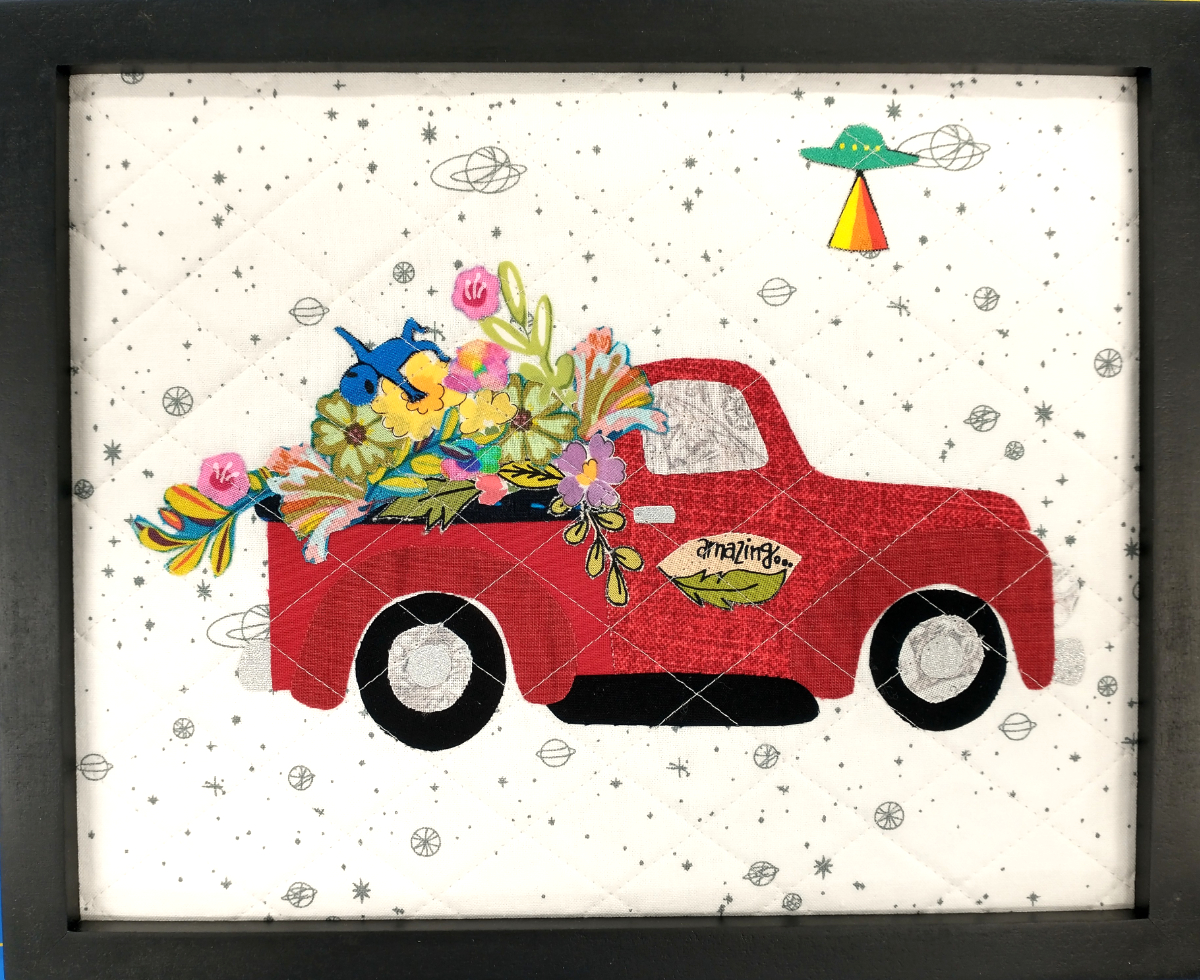 A while back I found this pattern by Triangle Frenzy (Bunnie Cleland) and it was just too good to pass up. I made the first quilt from an ombre floral. I don’t have a beauty shot of it yet, but here it is hanging at Studio Stitch to sell the pattern.