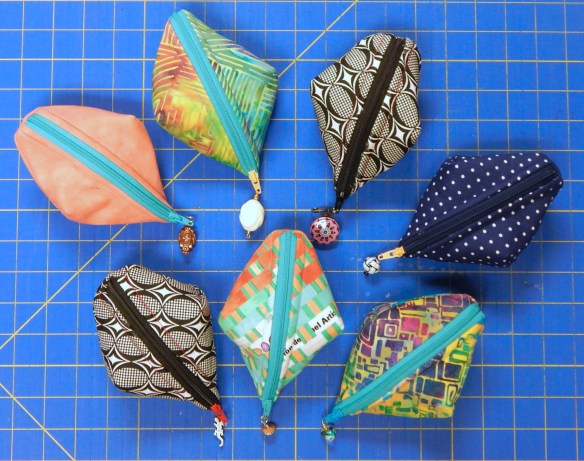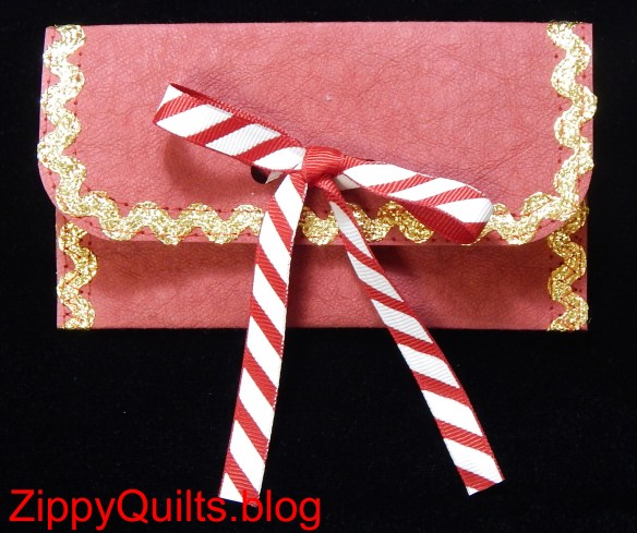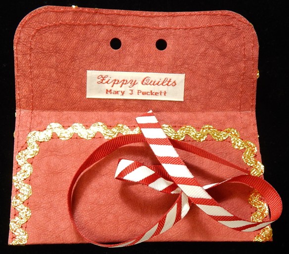 Note that the ribbon has to be attached before the pocket is sewn to the back along the sides! At that point, I checked to be sure the pouch would be the right size for the card when I eventually sewed the pocket up. Yep, so far, so good.