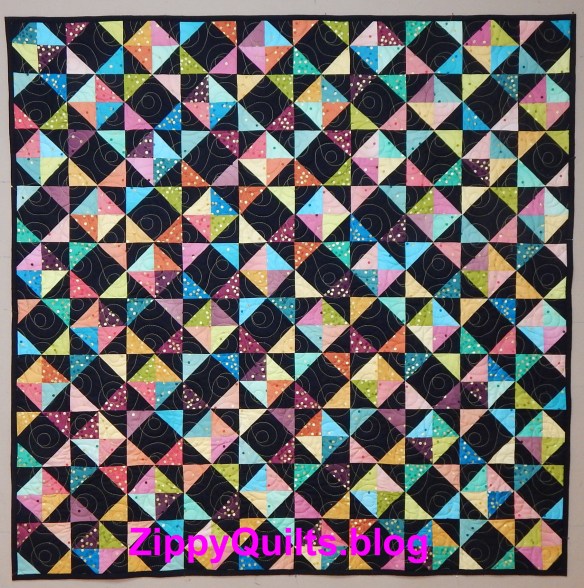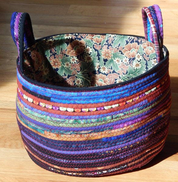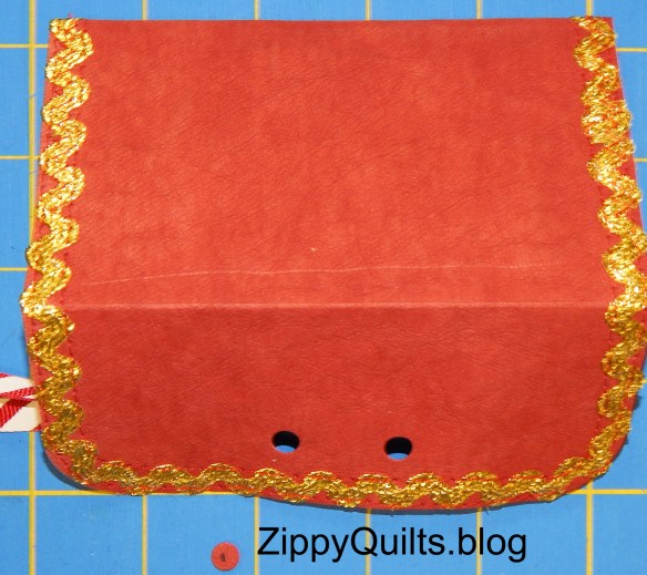 I then sewed this gold metallic rick-rack (from a yard sale!) around the outside edge. To do this, I lengthened the stitch on my machine to 3 (on Bernina) and sewed with a straight stitch along both edges, catching the points of the rick-rack. It’s not a good idea to back-stitch on Kraft-Tex, so I just sewed a couple of stitches over at the finish so the start and finish overlapped. I did treat the ends of the rick-rack, as well as the ends of the ribbon for the tie, with Fray Check, which dries clear and doesn’t show. Here are pictures of both sides.
