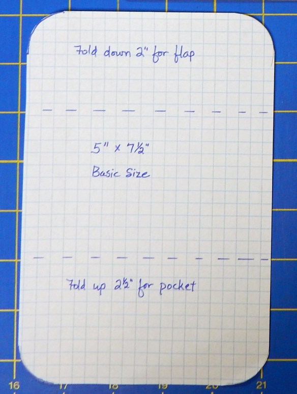 I took out a gift card and checked the size, then made a paper pattern 5″ x 7.5″. I used a spool to round the corners and tested where I wanted the pocket to fold up and the flap to fold down.