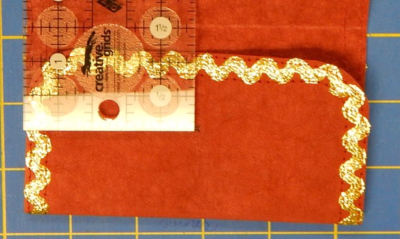 After the rick-rack was attached, I again folded along the lines I had scored previously and marked a spot on the middle of the lower flap that would form the pocket. So, I made a tiny mark 2.5″ from each side of the piece and 1.5″ below the upper fold as a placement mark for the ribbon.