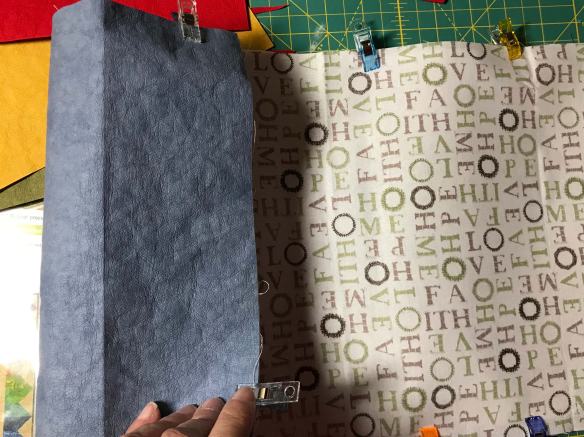Now lay the Kraft-Tex down on the fusible side of the trimmed lining. Note that Kraft-Tex has a slightly different texture on each side, but there is no “right” side–use the one you like best. Get everything centered, then turn the decorative edge to the outside and clip it in place with something heatproof.