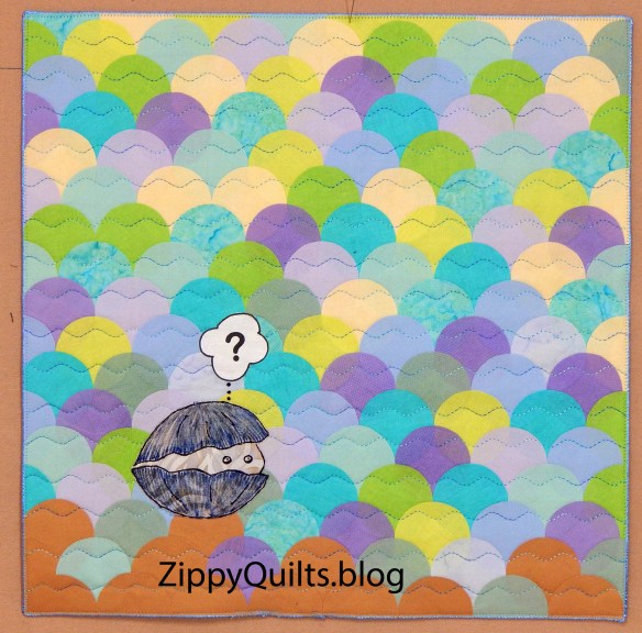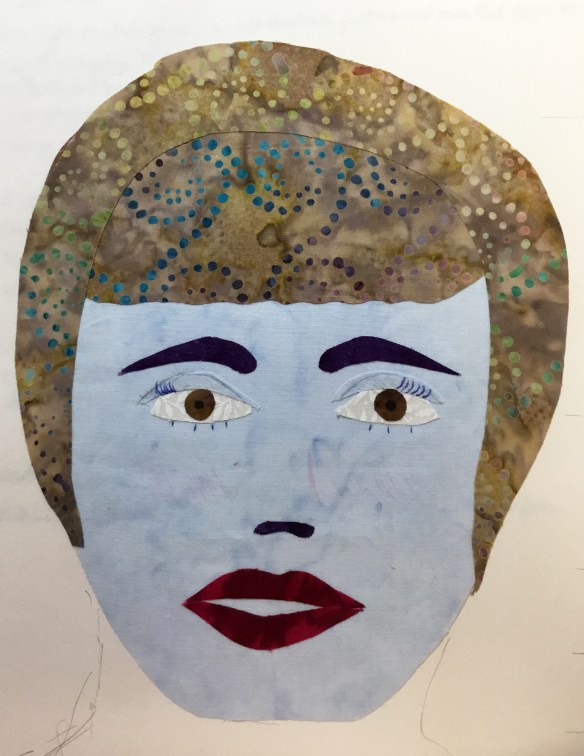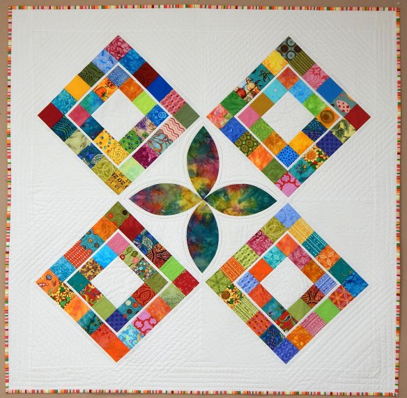 I use wool felt as the “batting” for wall quilts now, having learned from one of the many books I read that it is more stable for that purpose. It does, indeed, produce a nice firm quilt and this small one won’t sag even though it is to be hung with two loops at the top instead of a sleeve and rod.