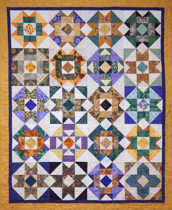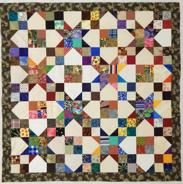 And finally, even when I buy fabric for a quilt, I often buy fat quarters, which pretty much guarantees a scrappy look. And I don’t really like making the same block twice, so often I make a variety of blocks for a single quilt. Here is one last example of a quilt made from a fat quarter bundle, though it appears scrappy.