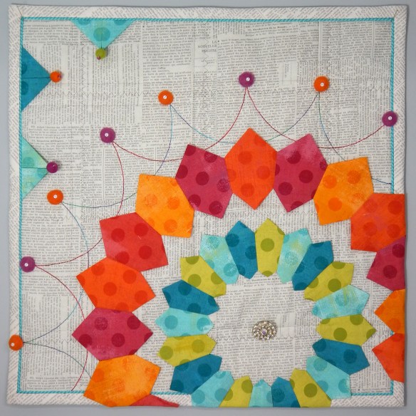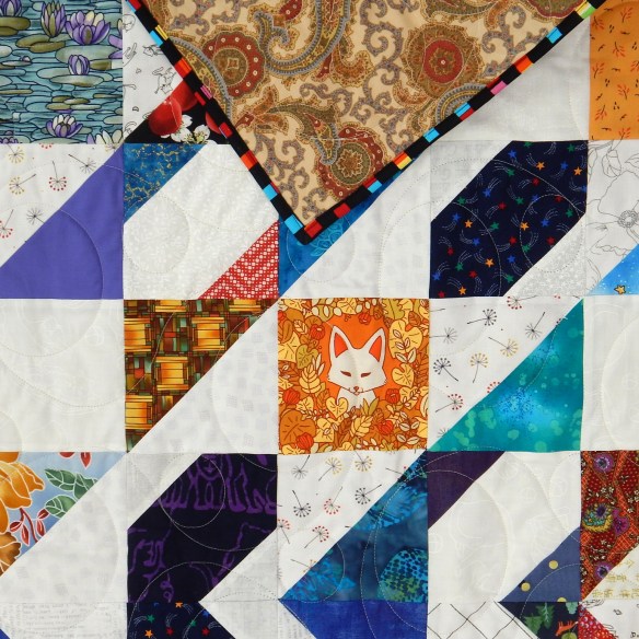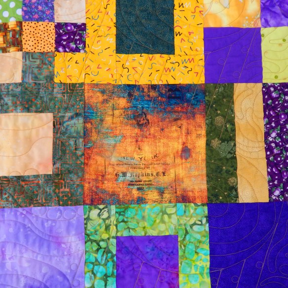 This first one was made from blocks I used as leaders and enders. I took a bag of single-color scraps and joined them randomly, sometimes inserting a spark of another color just for fun. The background is a navy fabric with fun gold swirls that I’ve had for some time and needed to use!